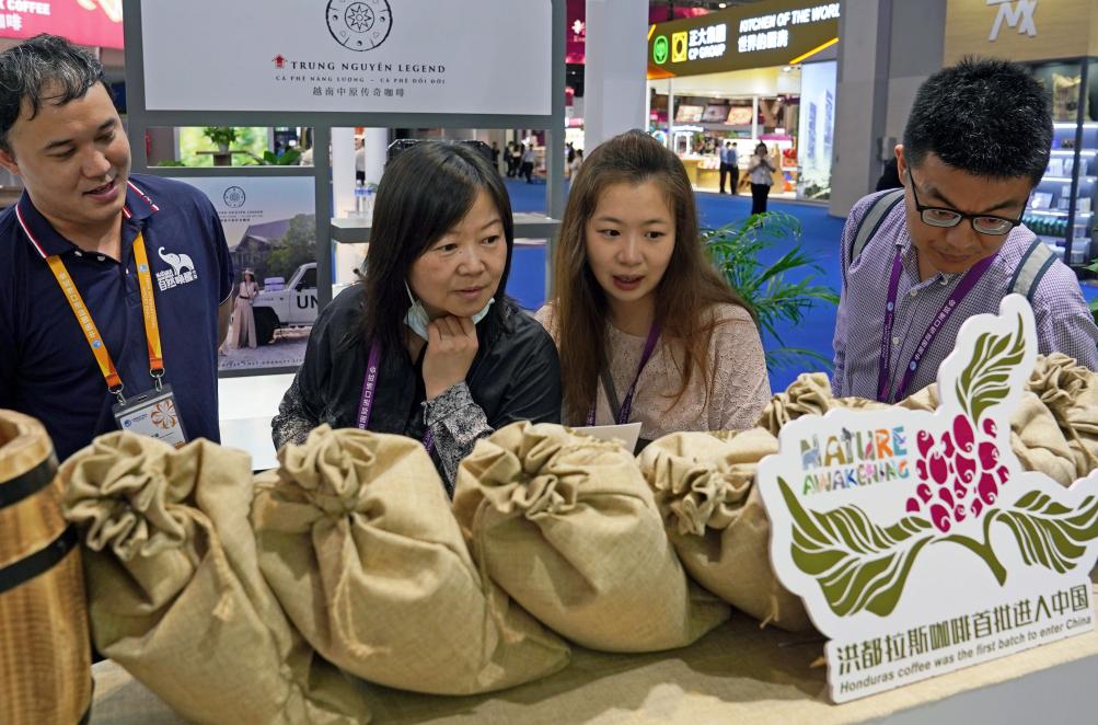 11月5日,觀眾在第六屆進博會食品及農產品展區(qū)參觀首次亮相中國的洪都拉斯咖啡豆。新華社記者 劉穎 攝