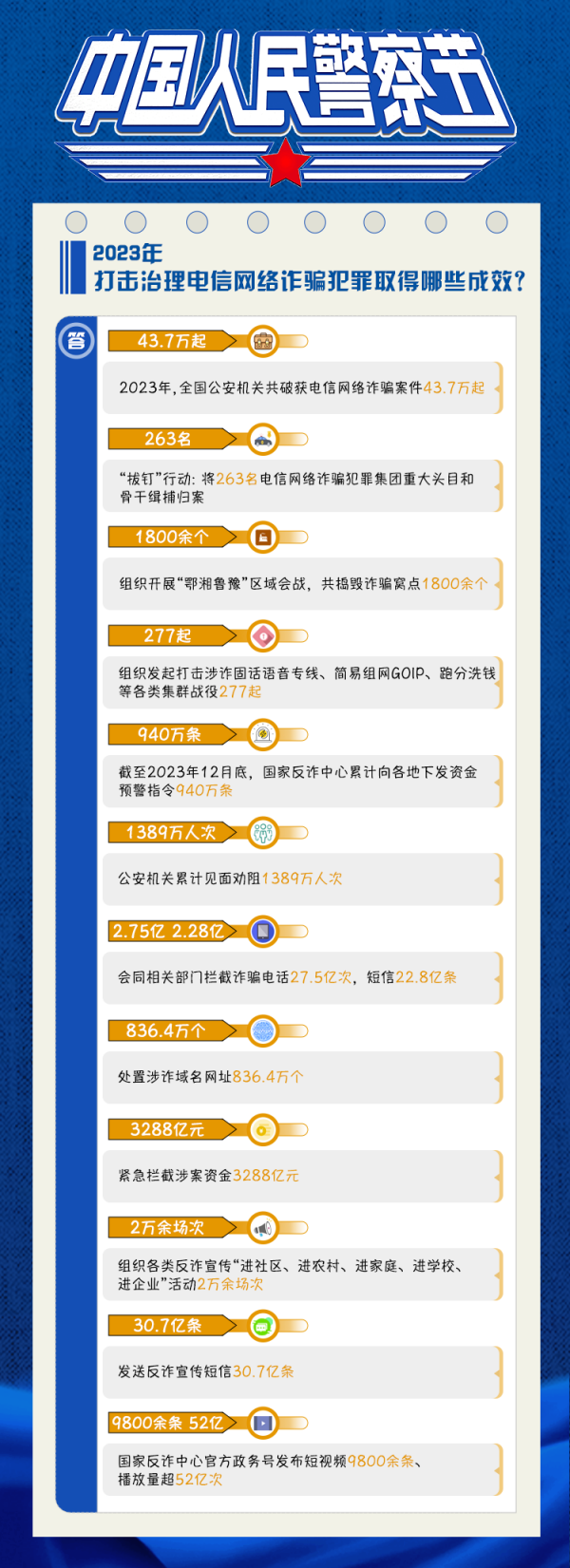 據(jù)發(fā)布會(huì)數(shù)據(jù),2023年,全國查處治安案件數(shù)與2022年基本持平,刑事案件立案數(shù)比2022年下降4.8%,全國社會(huì)治安形勢持續(xù)保持穩(wěn)定;全國公安機(jī)關(guān)共有253名民警、164名輔警因公犧牲,4565名民警、3311名輔警因公負(fù)傷,共授予(追授)一級英模5名、二級英模143名……