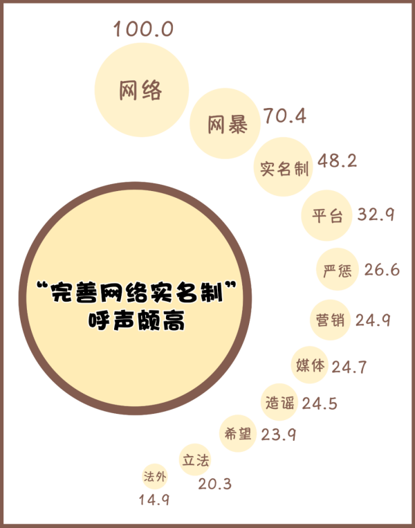 網(wǎng)絡暴力實施者借助網(wǎng)絡的隱蔽性,披著“隱形的斗篷”躲在暗處,享受著施暴的快感。對此,網(wǎng)民也紛紛發(fā)表觀點。分析“網(wǎng)絡暴力”有關熱門帖文下的評論可以看出,“實名制”“平臺”“嚴懲”等詞語出現(xiàn)頻率較高。