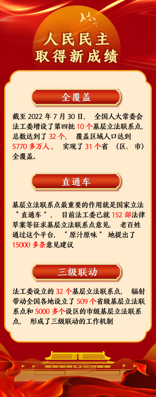 截至2022年7月30日,全國(guó)人大常委會(huì)法工委增設(shè)了第四批10個(gè)基層立法聯(lián)系點(diǎn),總數(shù)達(dá)到了32個(gè),實(shí)現(xiàn)了31個(gè)?。▍^(qū)、市)全覆蓋。32個(gè)基層立法聯(lián)系點(diǎn)覆蓋區(qū)域人口達(dá)到5770多萬(wàn)人,越來(lái)越多的老百姓在家門口就能對(duì)關(guān)切的法律問(wèn)題發(fā)表意見(jiàn)、表達(dá)訴求。
