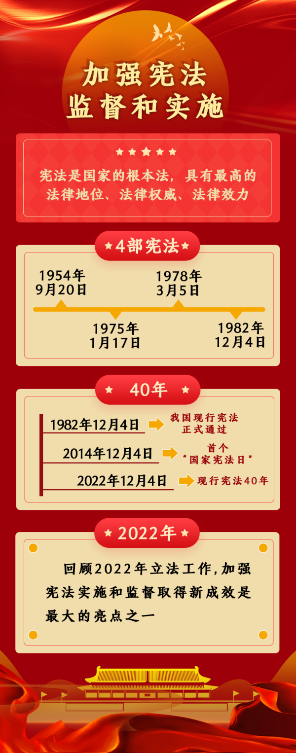 2022年是我國(guó)現(xiàn)行憲法公布施行40周年。這40年,也是我國(guó)改革開(kāi)放深入推進(jìn)、經(jīng)濟(jì)社會(huì)迅速發(fā)展、人民生活水平不斷提高的40年。回顧2022年立法工作,加強(qiáng)憲法實(shí)施和監(jiān)督取得新成效是最大的亮點(diǎn)之一。具體包括,不斷健全保證憲法全面實(shí)施的制度體系,通過(guò)完備的法律保證憲法實(shí)施,嚴(yán)格落實(shí)合憲性審查制度機(jī)制,深入推進(jìn)合憲性審查工作,更好發(fā)揮憲法在治國(guó)理政中的重要作用,維護(hù)憲法權(quán)威和尊嚴(yán)。