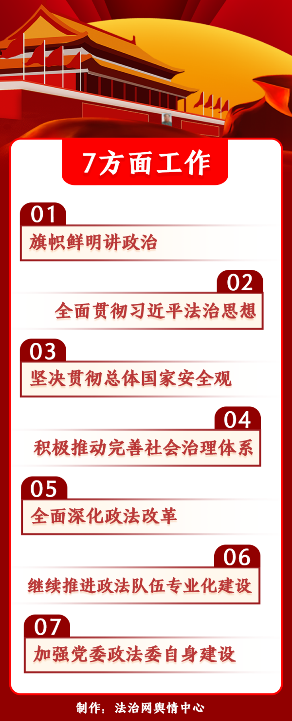 會(huì)議要求抓好七方面工作:旗幟鮮明講政治;全面貫徹習(xí)近平法治思想;堅(jiān)決貫徹總體國(guó)家安全觀;積極推動(dòng)完善社會(huì)治理體系;全面深化政法改革;持續(xù)推進(jìn)政法隊(duì)伍專業(yè)化建設(shè);加強(qiáng)黨委政法委自身建設(shè)。