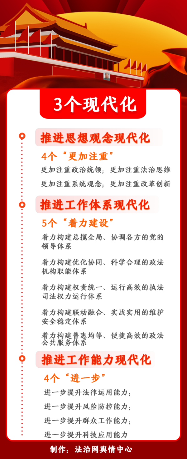 據(jù)法治網(wǎng)報(bào)道,本次會(huì)議提出要推進(jìn)政法工作三個(gè)現(xiàn)代化:推進(jìn)思想觀念現(xiàn)代化;推進(jìn)工作體系現(xiàn)代化;推進(jìn)工作能力現(xiàn)代化。