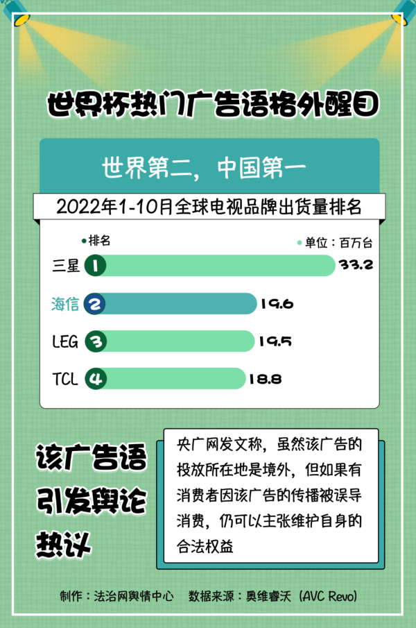 本屆世界杯不乏中國(guó)元素,其中,海信“中國(guó)第一,世界第二”的廣告語(yǔ)引發(fā)了輿論熱議。而熱議的焦點(diǎn),一方面在于廣告語(yǔ)中的排名是否有據(jù)可循;另一方面,該標(biāo)語(yǔ)是否涉嫌違法。
