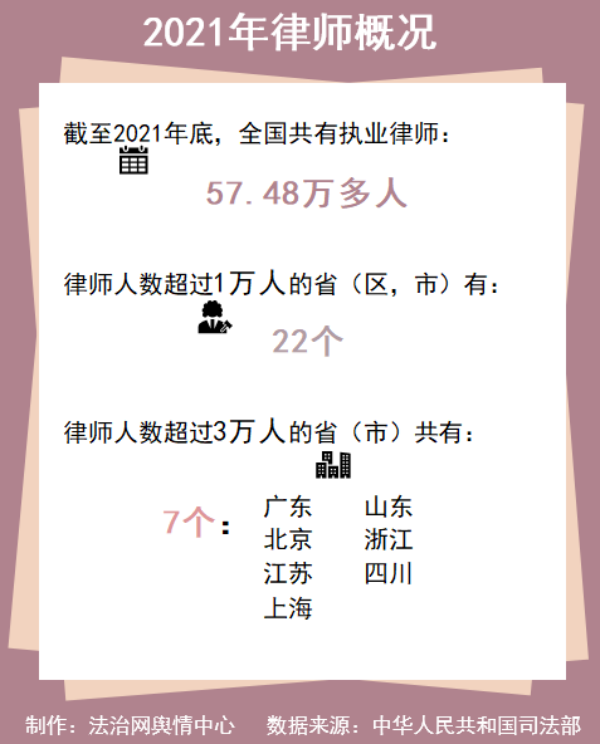 2017年至2021年,我國執(zhí)業(yè)律師人數(shù)每年都在以超過10%的速度增長。截至2021年底,全國共有執(zhí)業(yè)律師57.48萬多人,律師人數(shù)超過1萬的省(區(qū)、市)有22個(gè),律師人數(shù)超過3萬的?。ㄊ校┯?個(gè)。