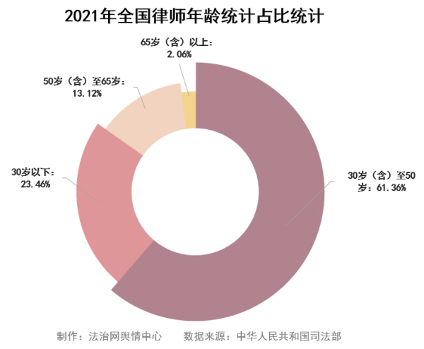 從年齡結(jié)構(gòu)來看,律師行業(yè)處于老中青共存階段。其中,30歲-50歲律師占比最高,達(dá)61.36%,30歲以下律師占比達(dá)23.46%,律師隊(duì)伍年輕化趨勢(shì)明顯。