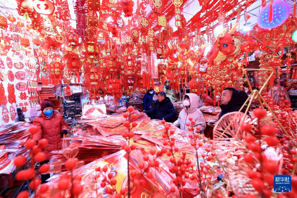 1月20日,人們在河北省石家莊市南三條年貨批發(fā)市場選購春節(jié)飾品。新華社發(fā)(梁子棟攝)
