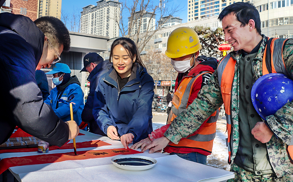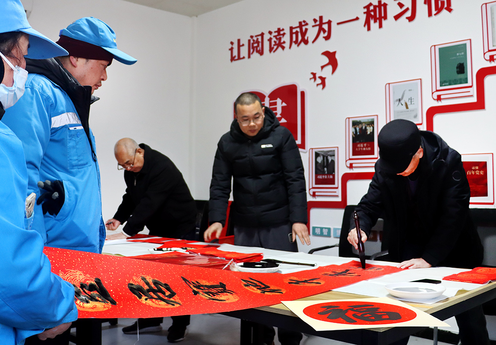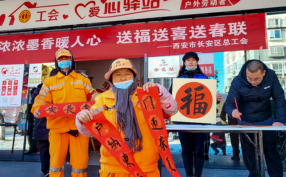 活動現(xiàn)場,長安區(qū)總工會邀請的多位知名書法家現(xiàn)場揮毫潑墨,把對新春的美好愿望傾注筆尖,書寫出一副副寓意美好、包含祝福的春聯(lián)和“福”。驛站周邊的環(huán)衛(wèi)工人、停車收費(fèi)員,快遞小哥及市民群眾,高興地挑“?!弊帧⑦x春聯(lián),提前感受到了濃濃的“年味”