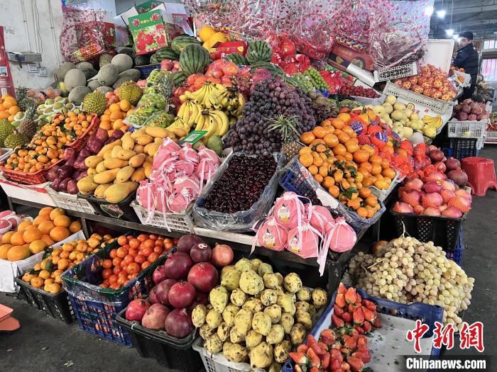 來到當(dāng)?shù)刂牟└窭r(nóng)貿(mào)市場,只見各類水果早已堆滿貨架,靜待市民“置年貨”。張峰 攝
