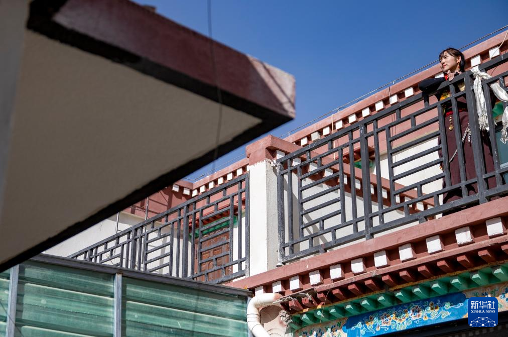 丹增在森布日生態(tài)搬遷安置點(diǎn)的新家陽(yáng)臺(tái)上看風(fēng)景(1月24日攝)。