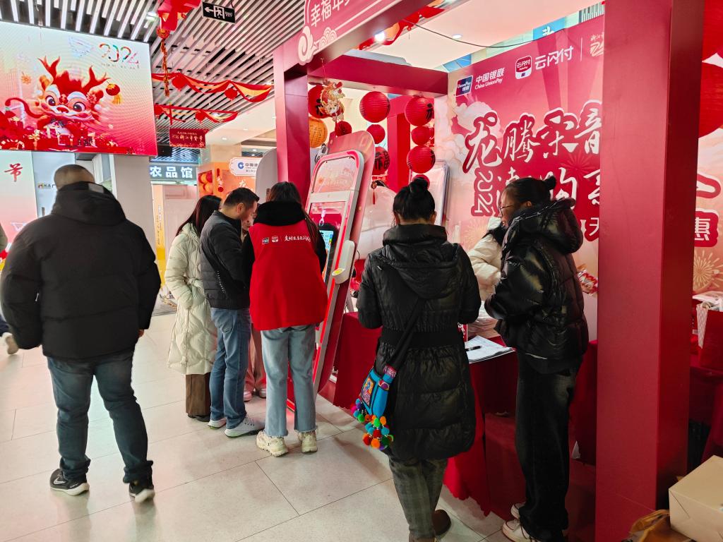 消費(fèi)者在2024浙江年貨節(jié)中國(guó)銀聯(lián)浙江分公司展位參與互動(dòng)游戲。新華社記者張曉潔 攝