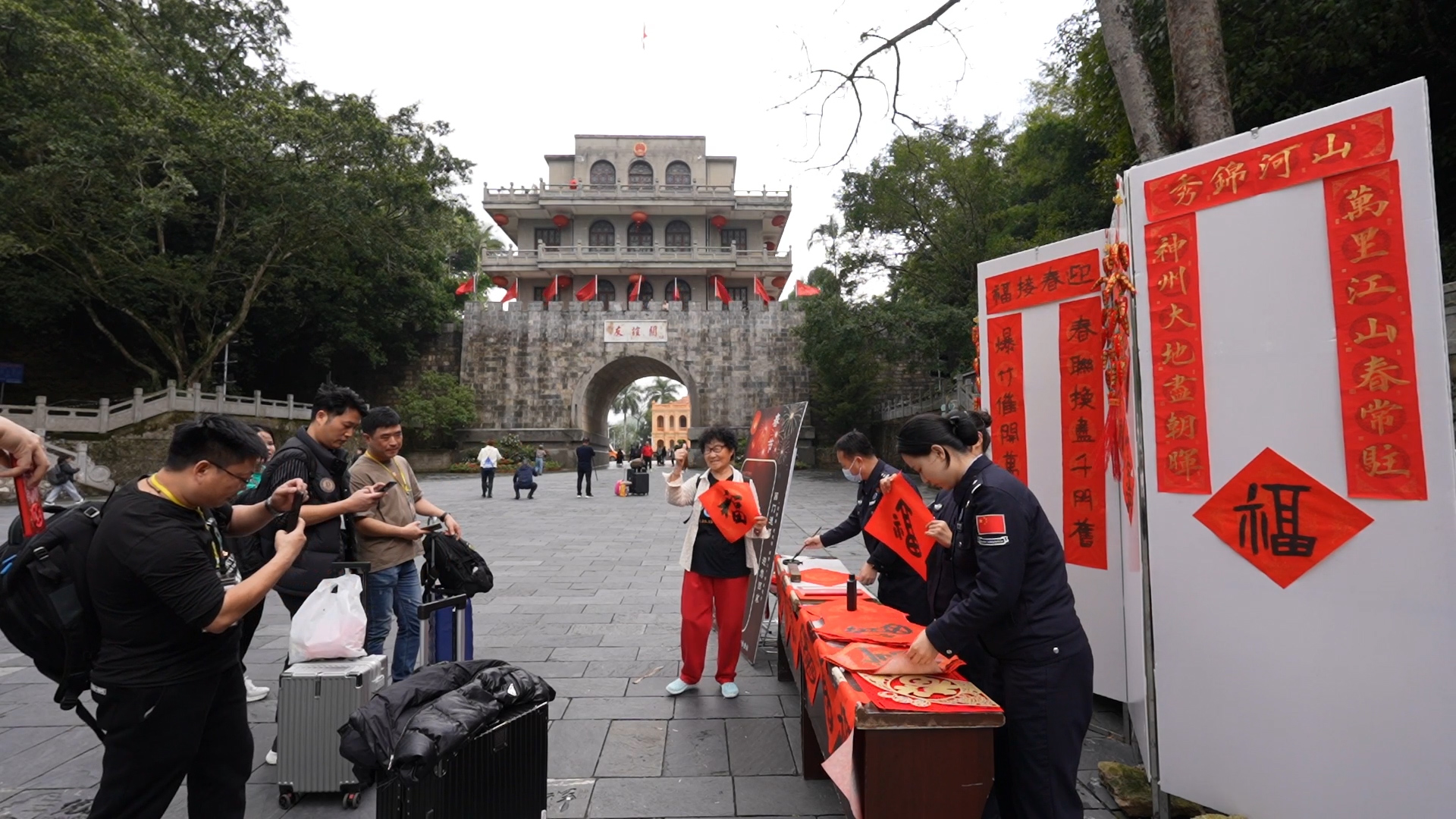 2月2日9時(shí),千年雄關(guān)友誼關(guān)前人頭攢動(dòng),出入境旅客絡(luò)繹不絕,一片熱鬧的景象。廣西出入境邊防檢查總站友誼關(guān)出入境邊防檢查站移民管理警察在此為廣大旅客寫對(duì)聯(lián)送福字。