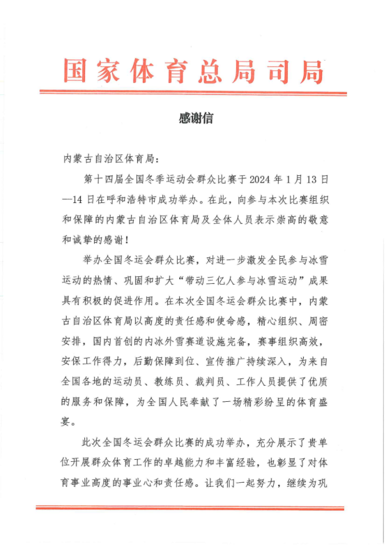 2月1日,國(guó)家體育總局群體司向內(nèi)蒙古自治區(qū)體育局發(fā)來(lái)感謝信,對(duì)內(nèi)蒙古自治區(qū)成功舉辦第十四屆全國(guó)冬季運(yùn)動(dòng)會(huì)群眾比賽表示充分肯定和高度贊揚(yáng)。信中指出,舉辦全國(guó)冬運(yùn)會(huì)群眾比賽,對(duì)進(jìn)一步激發(fā)全民參與冰雪運(yùn)動(dòng)的熱情、鞏固和擴(kuò)大“帶動(dòng)三億人參與冰雪運(yùn)動(dòng)”成果具有積極的促進(jìn)作用。本屆賽事賽道設(shè)施完備,賽事組織高效,后勤保障到位,宣傳推廣持續(xù)深入,為全國(guó)人民奉獻(xiàn)了一場(chǎng)精彩紛呈的體育盛宴。希望在共同努力下,為鞏固和擴(kuò)大“帶動(dòng)三億人參與冰雪運(yùn)動(dòng)”成果、推進(jìn)群眾冰雪運(yùn)動(dòng)發(fā)展做出更大的貢獻(xiàn)。