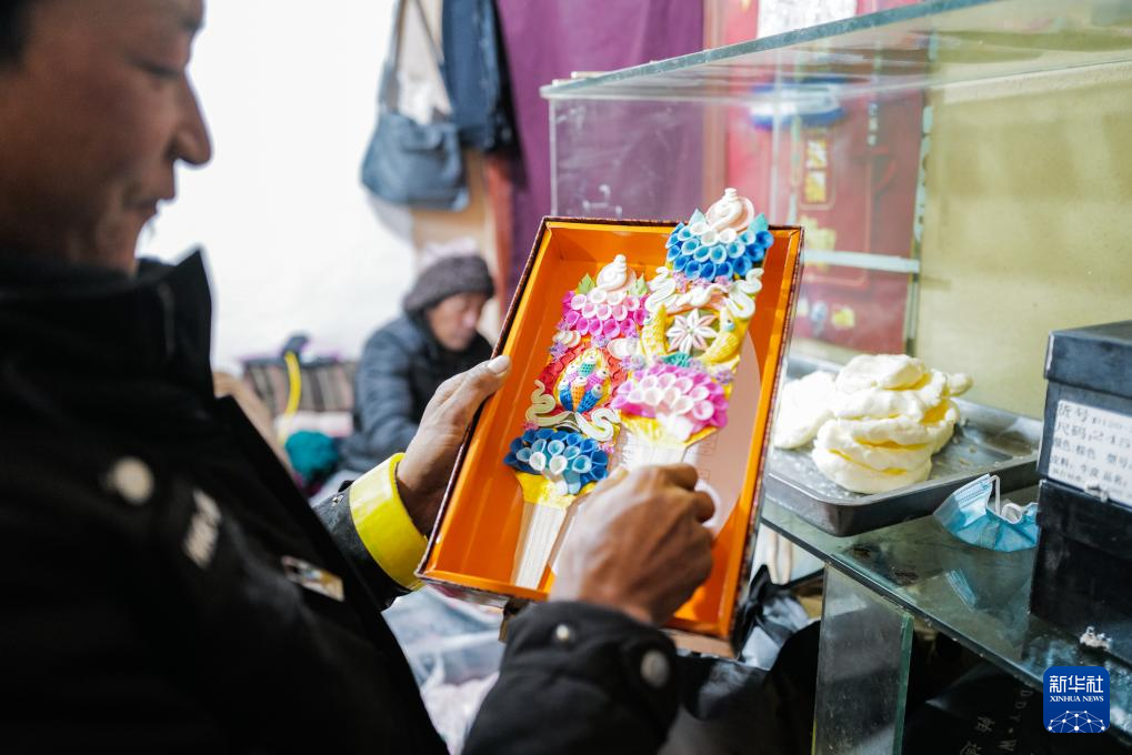 在拉薩八廓商城,制作完成的酥油花被放進(jìn)盒中存放(2月7日攝)。