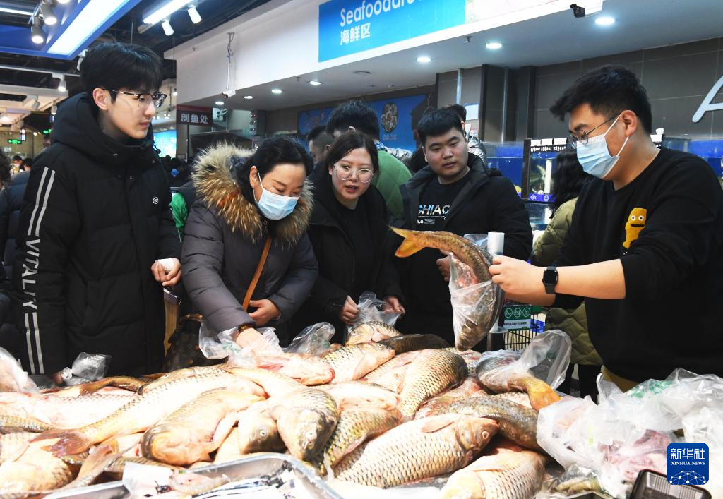 2月7日,顧客在河北石家莊新樂市一家超市選購海鮮產品。