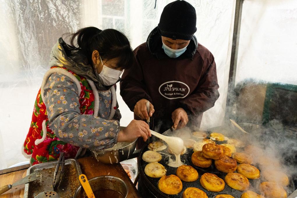 圖為哈爾濱紅專街早市里的商戶在攤位制作肉蛋堡。新華社記者 陳冬書 攝