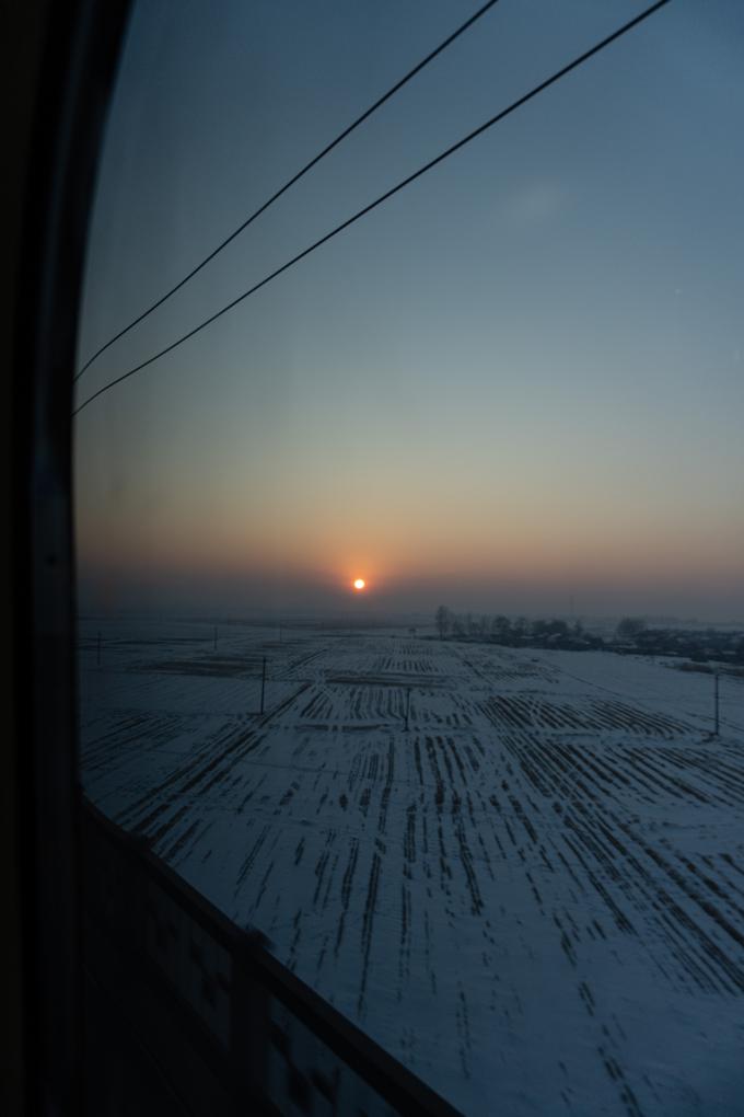 列車漸行漸北,夕陽在樺樹枝丫間穿梭,積雪把田間的秸稈垛覆蓋得只露了個(gè)頭兒,車門也開始結(jié)出霜花。