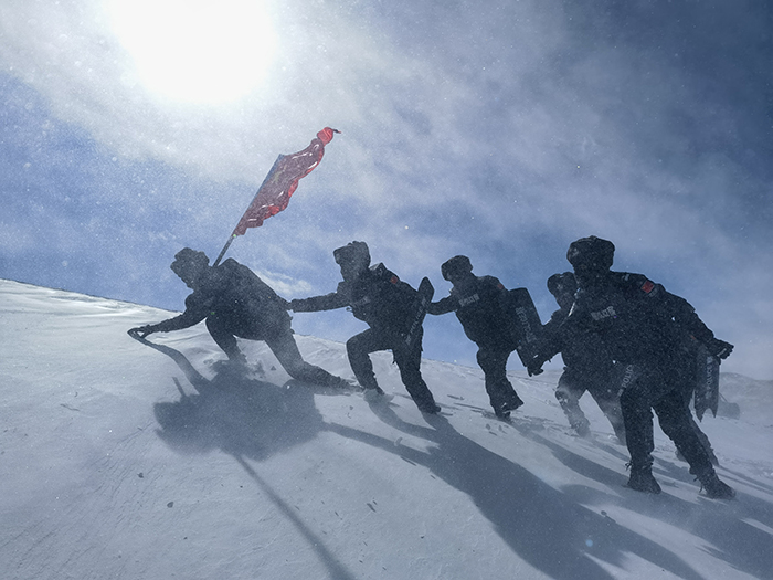 高低不平的碎石路被積雪厚厚覆蓋,很容易讓人忘記腳下暗藏坑洼。大家小心翼翼踩在被凍酥的雪面上,腳底下咔咔作響。民警王煒峰肩扛國旗走在隊伍最前列,狂風把國旗旗面吹得左右撞擊,發(fā)出噼里啪啦的聲響。這一抹鮮艷的中國紅,在皚皚白雪映襯下,格外奪目。