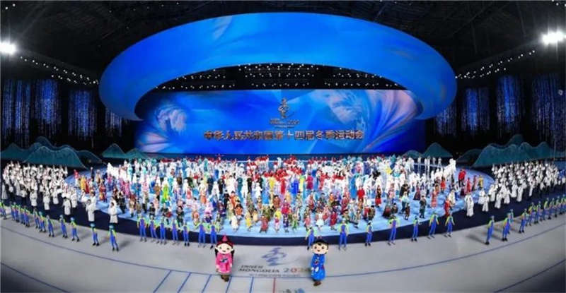 ▲2月17日晚,第十四屆全國冬季運動會開幕式在內(nèi)蒙古自治區(qū)冰上運動訓(xùn)練中心速滑館舉行。圖片來源:草原全媒