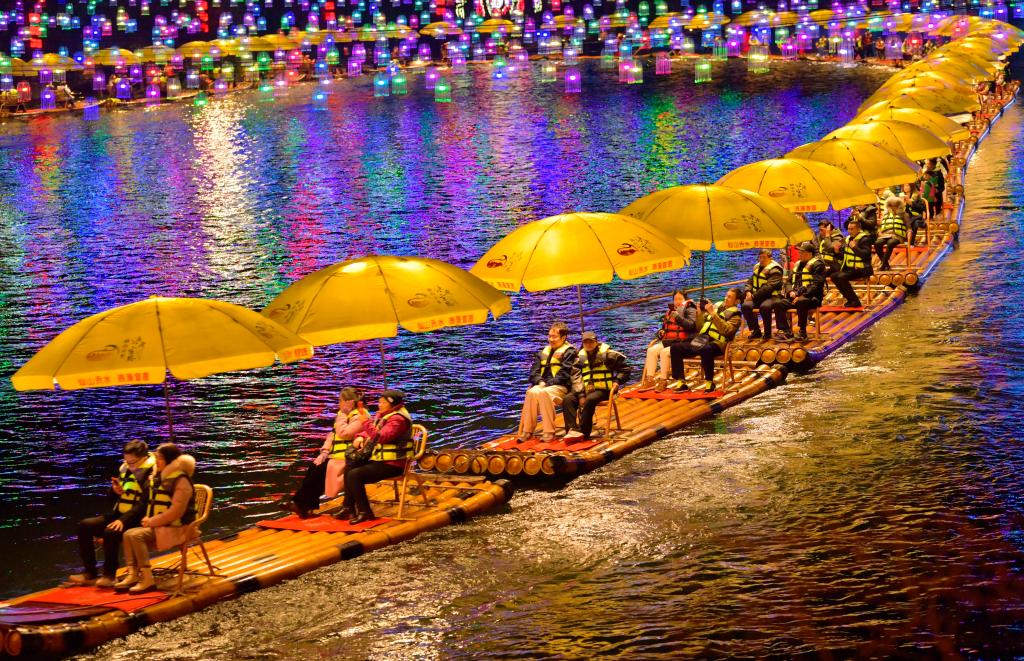 烤活魚一條街旁的河道里,花船載歌載舞,首尾相連的竹筏宛若游龍?jiān)诤拥乐序暄亚靶??!褒堄呜曀碧厣^光項(xiàng)目吸引了不少游客佇立岸邊“看稀奇”。