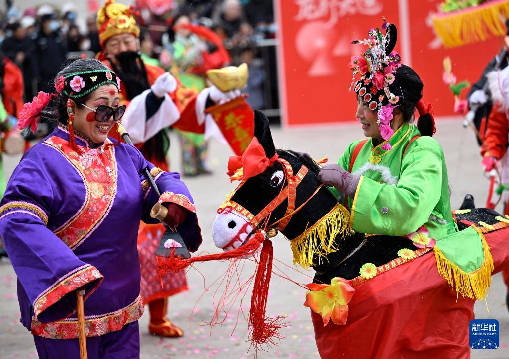 2月20日,在寧夏銀川市,參賽社火隊的演員表演傳統(tǒng)社火項目。