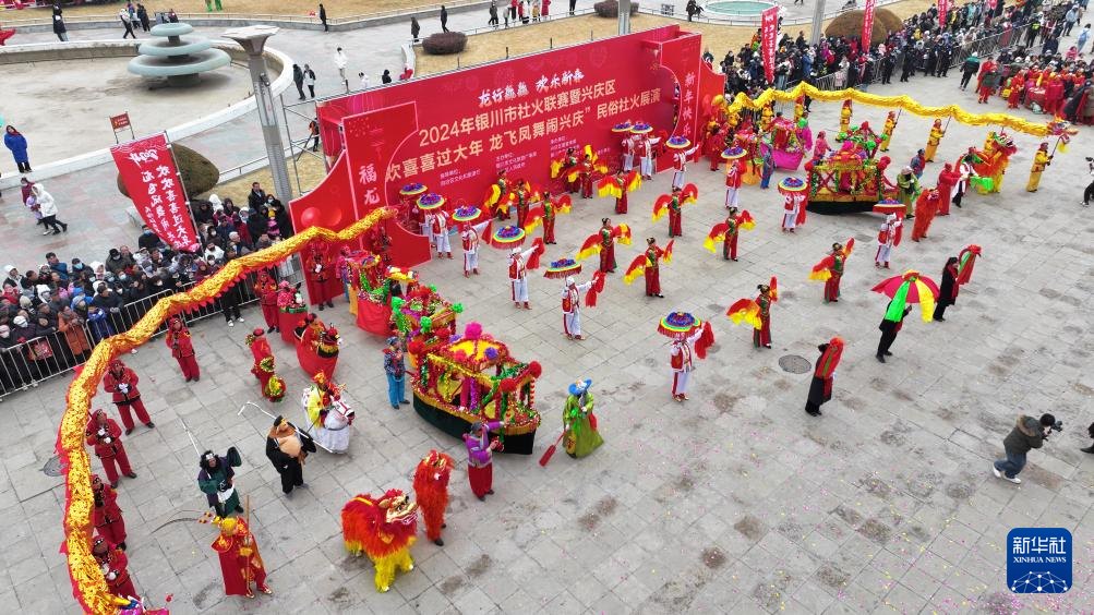2月20日,在寧夏銀川市,參賽社火隊(duì)的演員為市民表演傳統(tǒng)社火項(xiàng)目(無(wú)人機(jī)照片)。