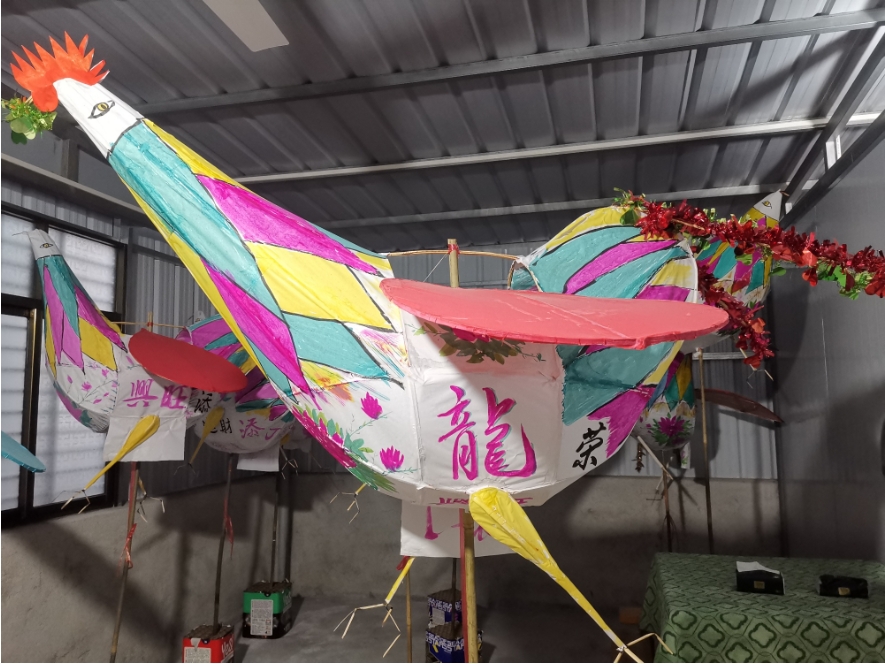 “客家方言中,‘燈’與‘丁’同音,雞公燈也寓意著財丁興旺?!敝苘矫饔么旨毑灰坏闹褡泳幊龉u外形,在竹架上糊上白紙,之后再上色,一個雞公燈便制作完成了。