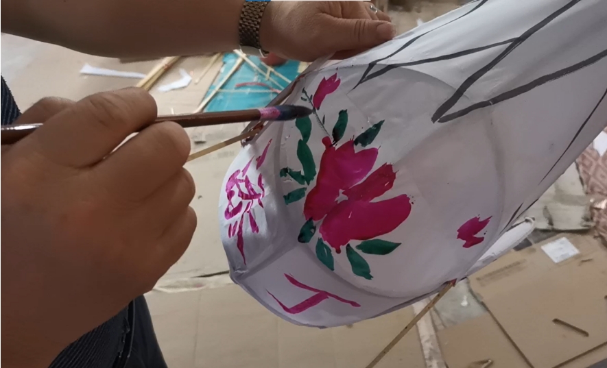 周芙明常用紅、綠、藍、黃幾種顏色。這樣畫出來的燈籠五彩斑斕,很是醒目。上好色、晾曬好的燈籠仍然少頭缺尾,此時再用彩帶纏至“雞尾”,糊上用紙做成的“雞冠”,這才算是大功告成。