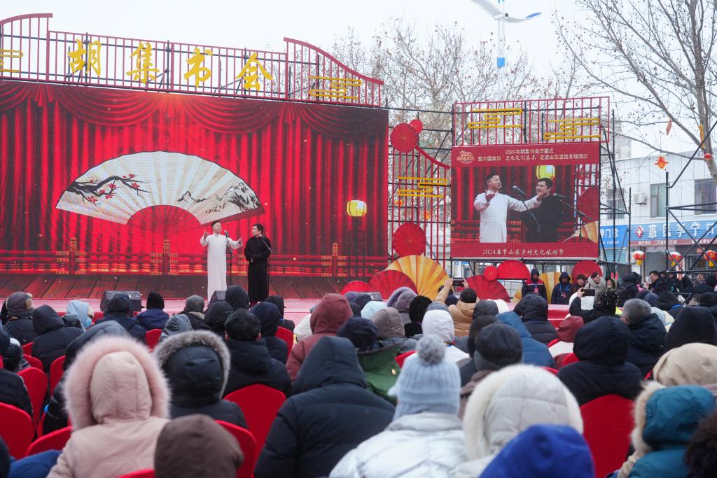 演員正在胡集書會現(xiàn)場表演相聲節(jié)目。新華社記者高天 攝