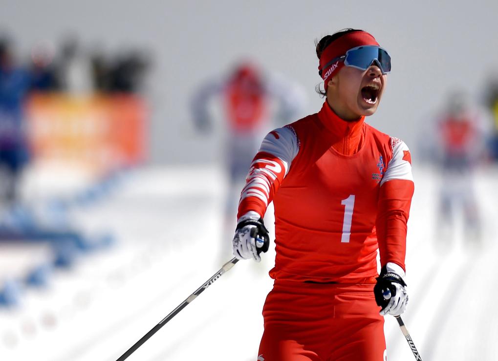 2月25日,黑龍江隊(duì)選手靳然在沖刺時(shí)慶祝。新華社記者 黃博涵 攝