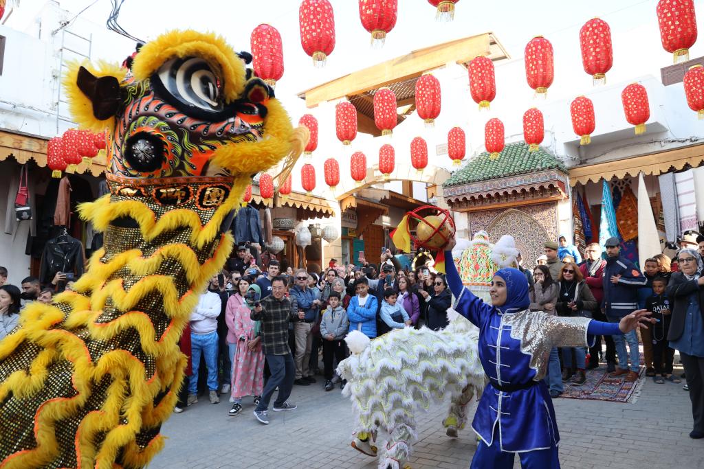 1月22日,人們?cè)谀β甯缡锥祭吞乩铣抢镉^看舞獅表演。當(dāng)日,由中國文化和旅游部、中國駐摩洛哥大使館主辦的2024摩洛哥“歡樂春節(jié)·中國廟會(huì)”活動(dòng)在摩洛哥首都拉巴特開幕,迎接即將到來的中國農(nóng)歷龍年春節(jié)。新華社記者 霍晶 攝