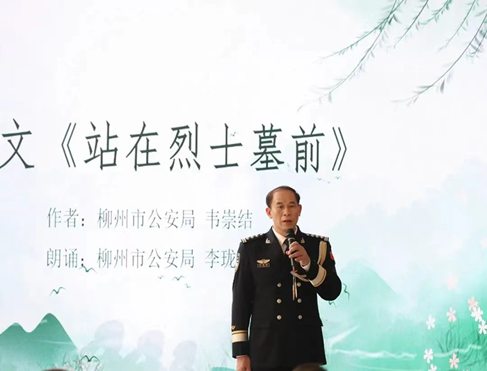 “群山肅穆,蒼松挺立,那一排排青灰的墓碑,在清明期間難得一見的陽光中閃著金色的光,數(shù)千名烈士安靜地長眠在這里……”清明至,柳州市公安局民警韋崇結(jié)創(chuàng)作的散文《站在烈士墓前》,深切懷念昔日英勇犧牲的戰(zhàn)友。韋崇結(jié)上臺分享創(chuàng)作感想時說,我們緬懷英烈,就是要繼承他們的遺志,從中汲取力量,繼續(xù)前行。