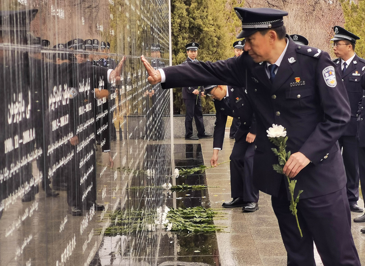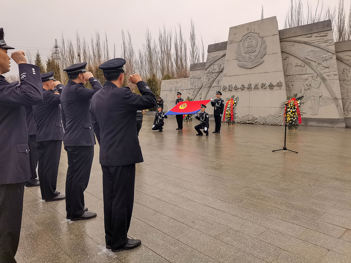 4月4日清明節(jié),新疆生產(chǎn)建設(shè)兵團(tuán)公安局組織民警來到烏魯木齊市烈士陵園,開展“致敬公安英烈 激發(fā)奮進(jìn)力量”主題黨日活動。參加活動的民輔警警容嚴(yán)整,面向新疆公安英烈墻默哀、鞠躬、敬獻(xiàn)鮮花,表達(dá)對烈士的敬意,緬懷英烈功績、繼承英烈遺志,追思他們忠誠于黨、不畏犧牲、無私奉獻(xiàn)的崇高革命精神,并在公安英烈墻前重溫入警誓詞。民警們還參觀了烈士事跡陳列館,追思烈士的英勇事跡。