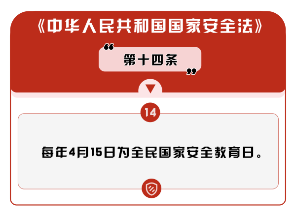 2015年7月1日,全國(guó)人大常委會(huì)通過(guò)的《中華人民共和國(guó)國(guó)家安全法》第十四條規(guī)定,每年4月15日為全民國(guó)家安全教育日。