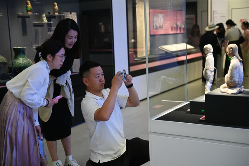 2024年5月6日,觀眾在陜西歷史博物館秦漢館拍攝漢代彩繪陶俑。新華社記者 李一博 攝