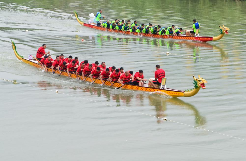 5月29日,在酉陽縣龍?zhí)舵?zhèn),龍舟隊在水面角逐。