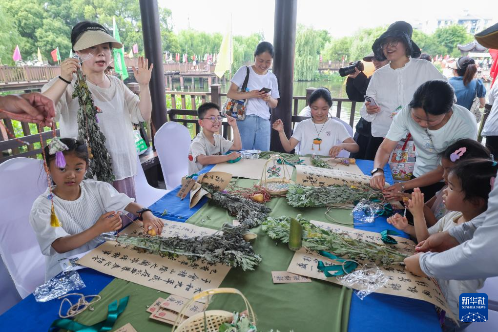 5月25日,在東林鎮(zhèn)泉益村活動現(xiàn)場,村民在做端午艾草花束。