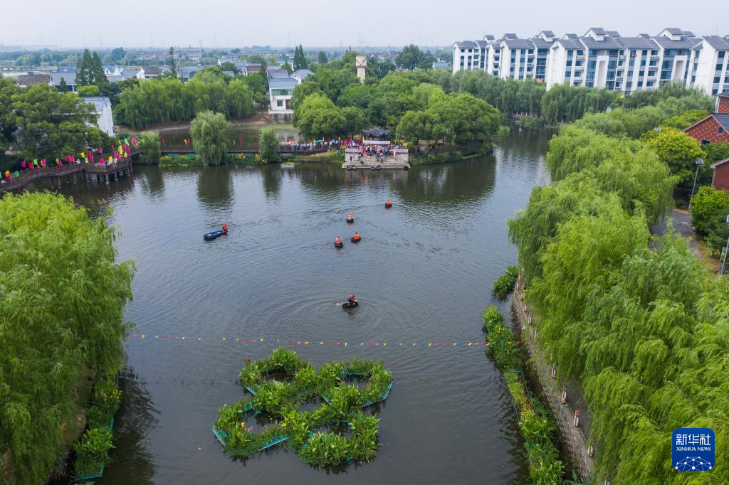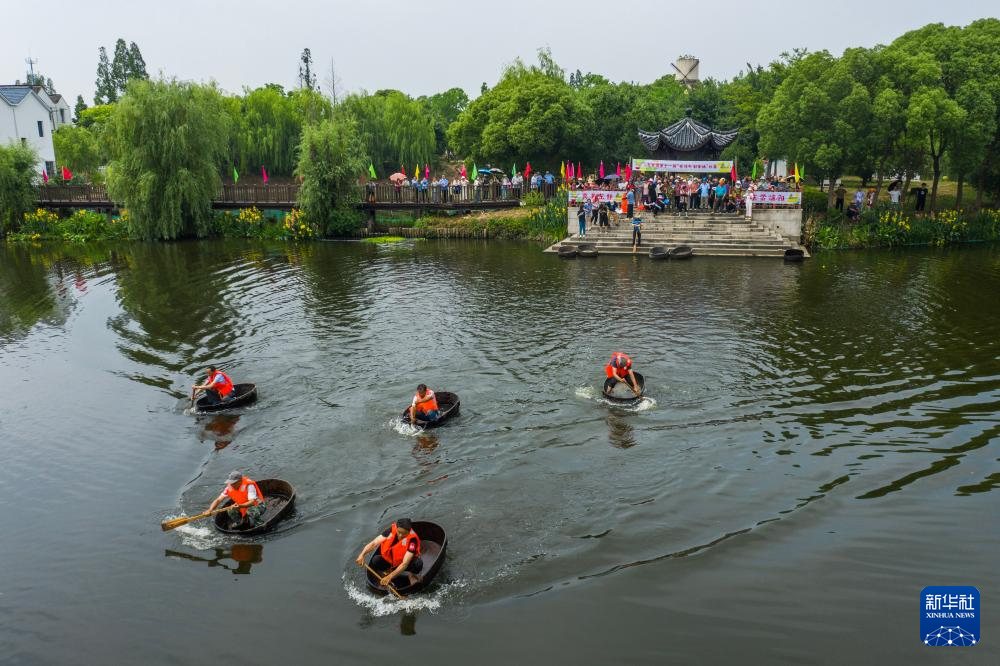 5月25日,村民們參加水鄉(xiāng)劃菱桶比賽。菱桶是河網(wǎng)密布的東林鎮(zhèn)百姓家中常見的一種傳統(tǒng)水上勞動工具,村民在捕魚、采菱、采荷時都要用到(無人機照片)。