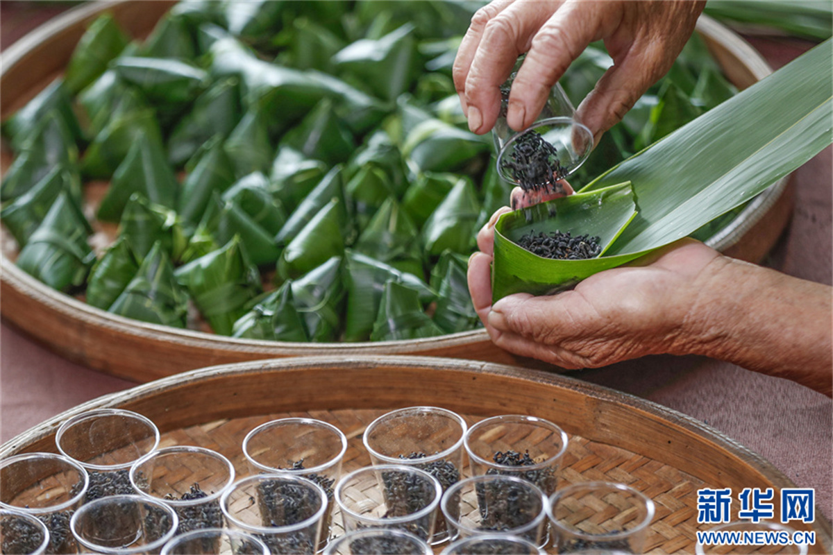 6月5日,在安徽省黃山市祁門縣古溪鄉(xiāng)際源村,茶工在包制“粽茶”。