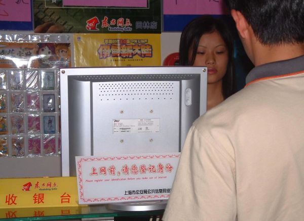 圖為2002年,《互聯(lián)網(wǎng)上網(wǎng)服務營業(yè)場所管理條例》施行,上海某網(wǎng)吧柜臺上寫著“上網(wǎng)前,請您登記身份”。(視覺中國)