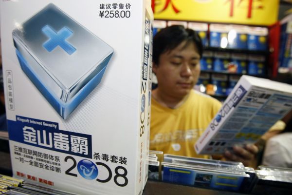 圖為2008年8月16日,某正版軟件商店內,顧客在選購國產正版殺毒軟件。 (視覺中國)