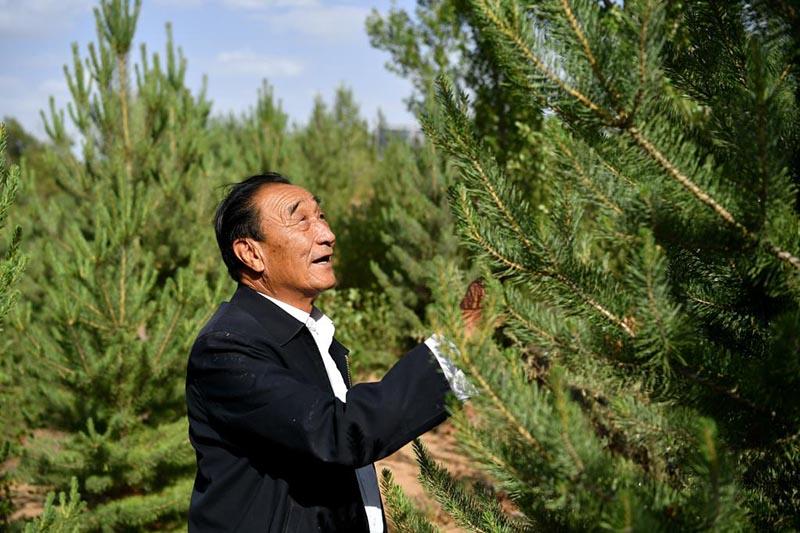 石光銀在自己最早治理的“狼窩沙”林地里。新華社記者 劉瀟 攝