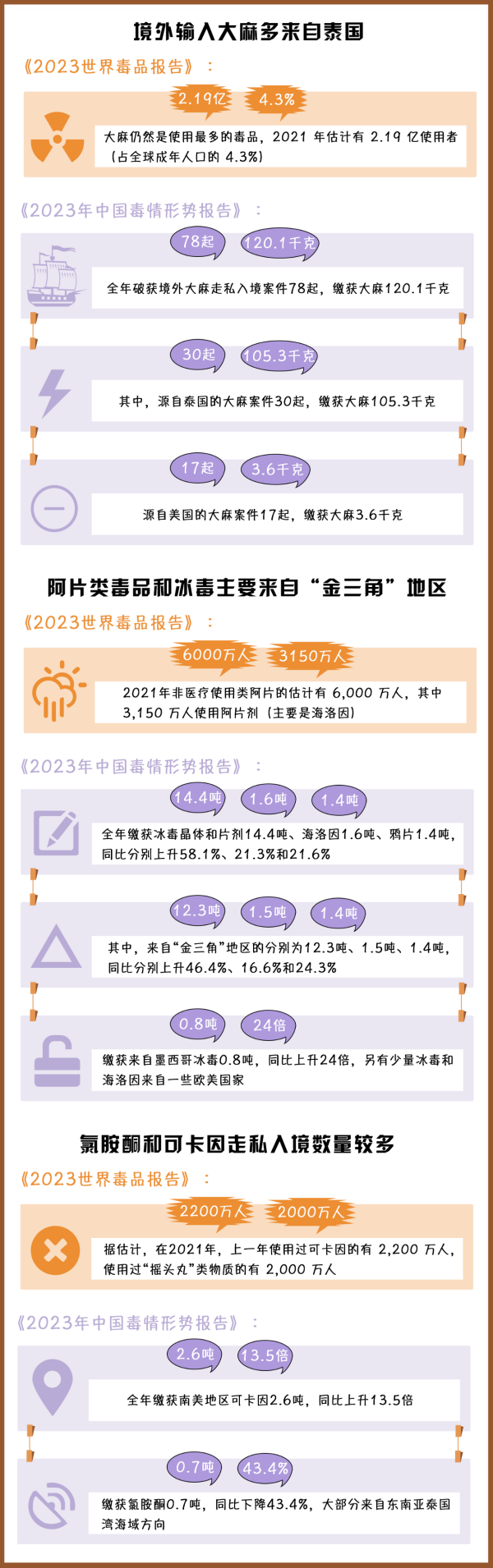 (制作:法治網(wǎng)輿情中心 數(shù)據(jù)來源:《2023年世界毒品報告》《2023年中國毒情形勢報告》)