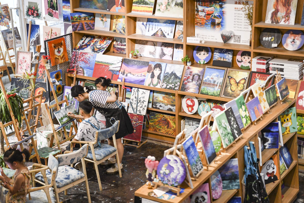 ↑7月15日,游客在重慶市江北區(qū)北倉文創(chuàng)街區(qū)體驗繪畫。