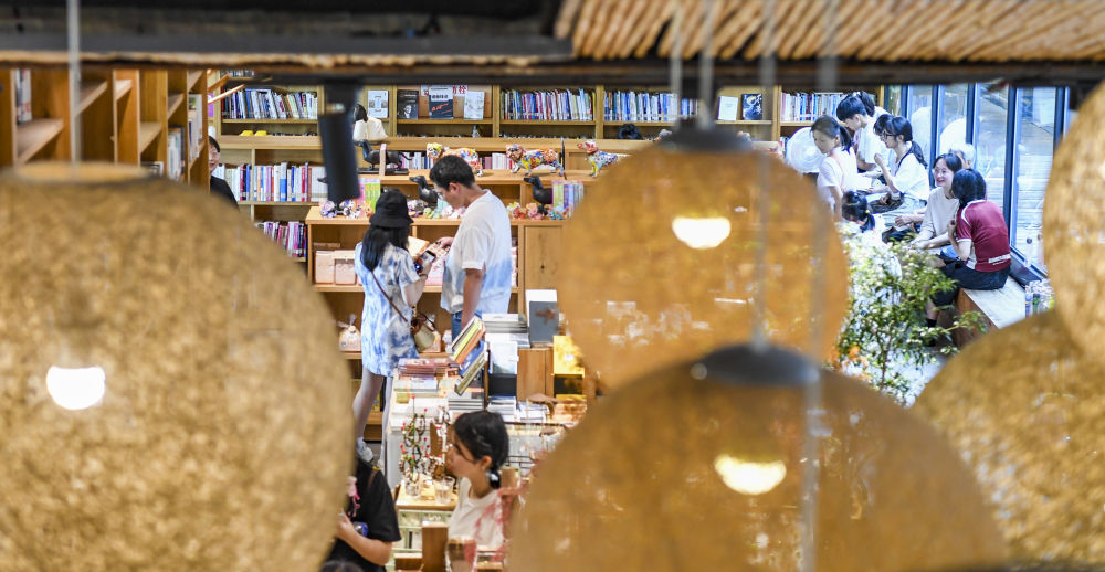 ↑7月15日,游客在重慶市江北區(qū)北倉文創(chuàng)街區(qū)休閑、選購文創(chuàng)商品。