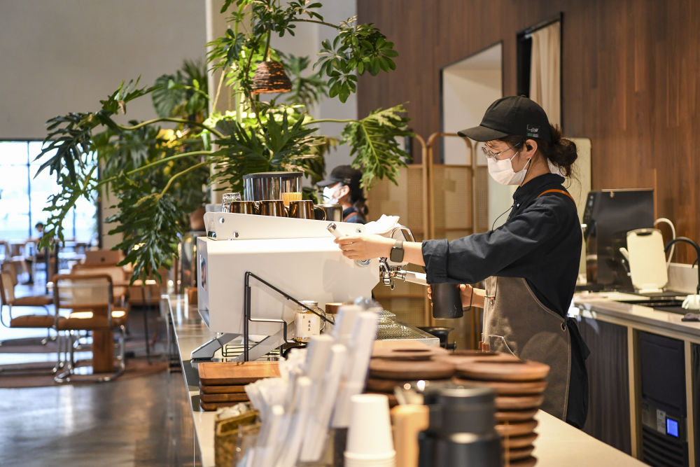 ↑7月15日,重慶市江北區(qū)洋炮局1862文創(chuàng)園內(nèi)的一咖啡館工作人員在制作咖啡。