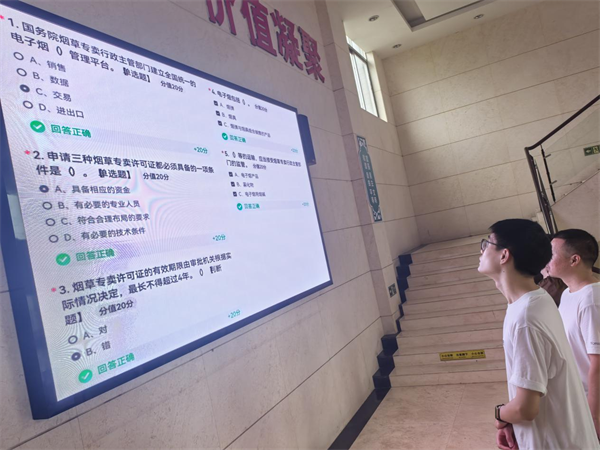 利用線上線下同時(shí)推進(jìn),形成合力,強(qiáng)化協(xié)調(diào)配合。線上,通過(guò)微信群督促打卡,確保全體干部職工按時(shí)保質(zhì)答題;線下,利用LED顯示屏滾動(dòng)播放煙草法律法規(guī)宣傳海報(bào),營(yíng)造全員學(xué)習(xí)的濃厚氛圍。