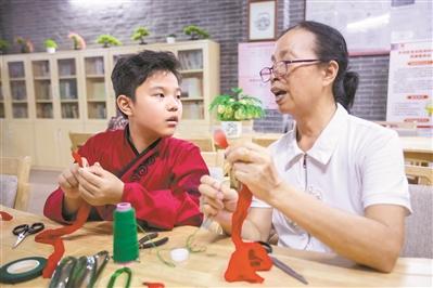 “巧姐”潘慧君給小學(xué)剛畢業(yè)的黃奕錚傳授制作乞巧作品的技巧