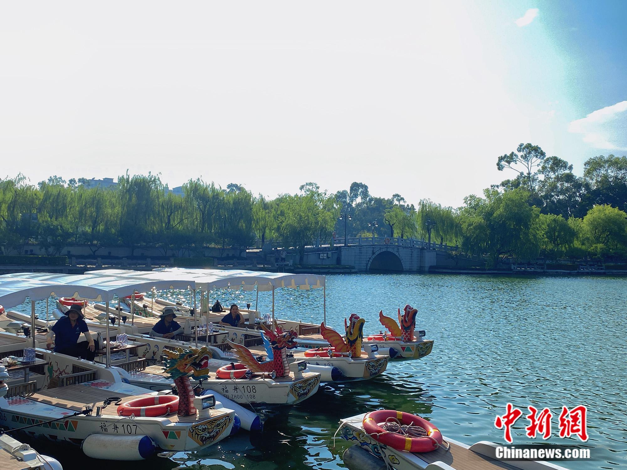 福州西湖岸邊的特色龍舟游船。蘇亦瑜 攝