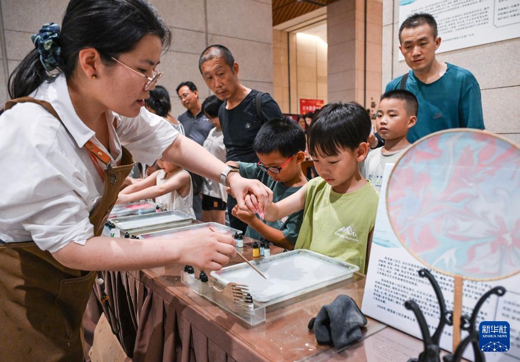 8月7日,在非遺體驗區(qū),小朋友在工作人員指導下體驗紙箋加工技藝。